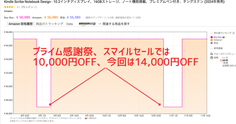 | Kindle Scribe Notebook Design(16GB) | 56,980円 | 42,980円 | 14,000円OFF | 25%OFF |
