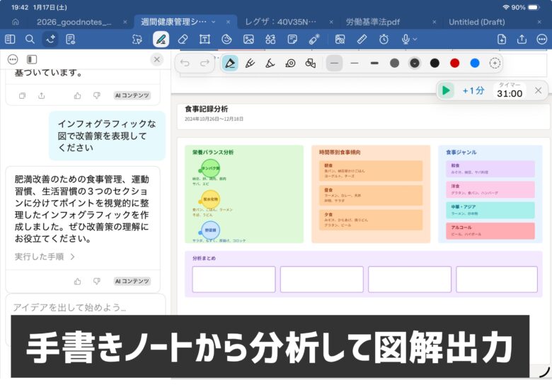 Goodnotesの録音は、ただ音を録るだけではありません。メモと音声が時系列で完璧に同期するため、後から文字をタップするだけで「その文字を書いた瞬間の音声」を聞き返すことができます。さらに文字起こしやAI要約も可能なため、復習や議事録作成の効率が劇的に上がります。