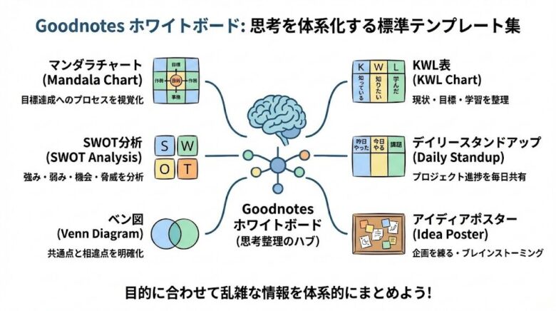Goodnotesのホワイトボードには、思考整理に役立つテンプレートが標準で多数用意されています。