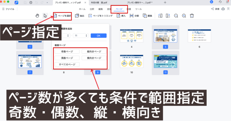 数十ページあるPDFの場合「すべてのページ」「横向きページ」「偶数ページ」のように一瞬で必要なページを指定でき、業務効率と抜け防止に使えます。