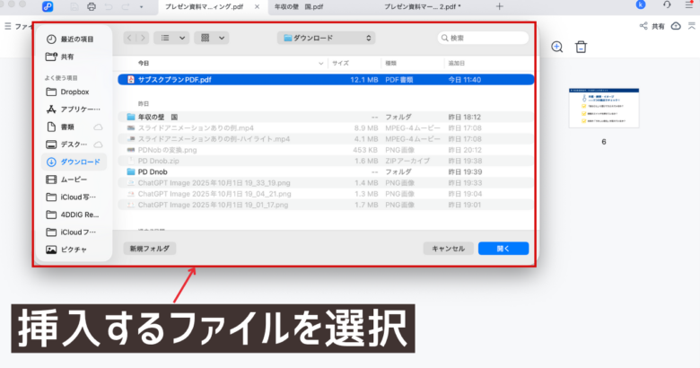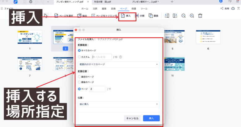 他のPDFファイルを取り込む機能が「挿入」です。