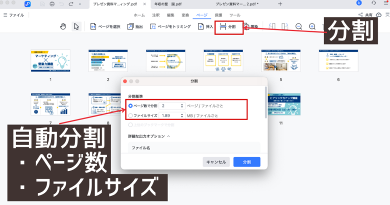 たくさんページがありすぎて、メールで送るには容量オーバーになる時に役立つのが「分割」です。
