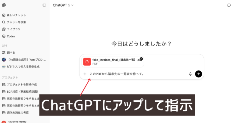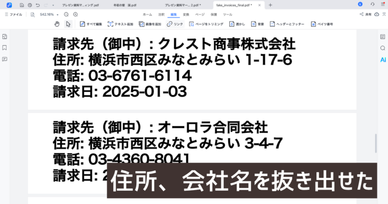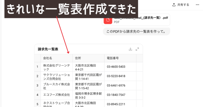 ChatGPT、NotebookLM、Geminiなどの生成AIに、住所と会社だけの情報にしたPDFをアップロードし「このPDFから請求書の一覧表を作って」と指示を出します。