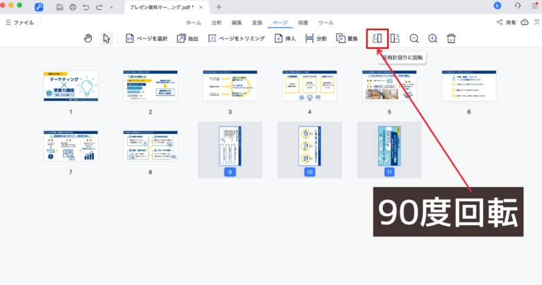 縦向きページが選択された状態で、90度回転のボタンをクリックします。