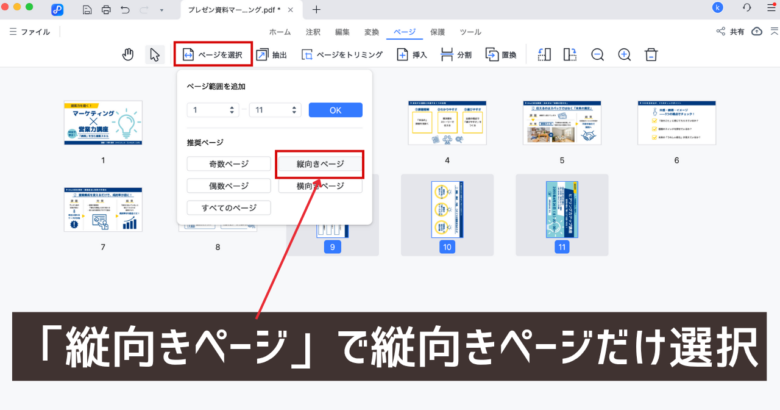 ページ選択で「縦向きページ」で縦向きページだけを自動選択できます。