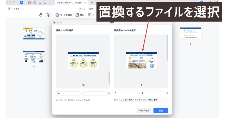 置換とは、PDF内の特定のページを別のページに差し替える(置き換える)機能のことです。
